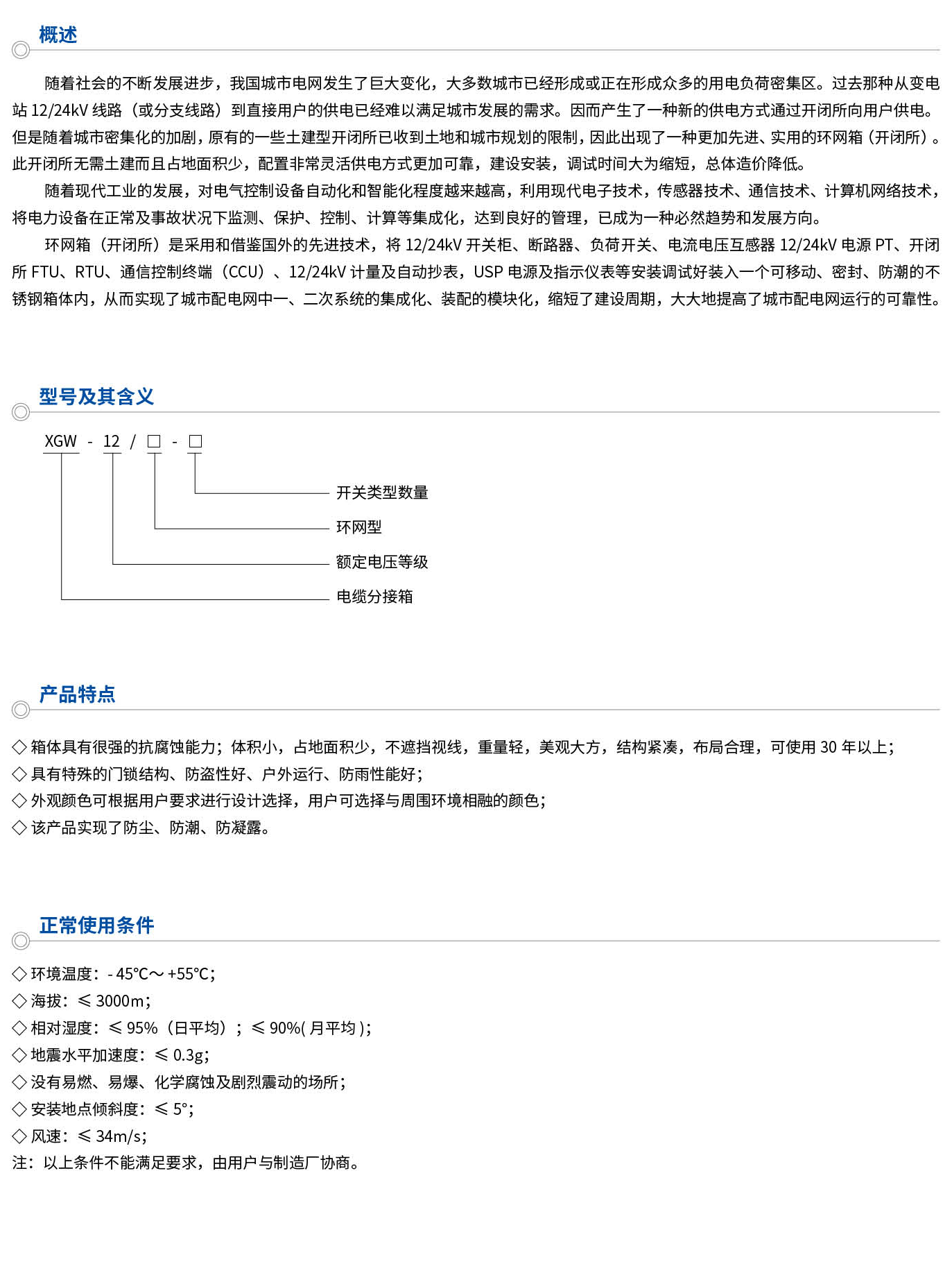 此開閉所無需土建而且占地面積少,配置非常靈活供電方式更加可靠,建設安裝,調試時間大為縮短,總體造價降低。環網箱(開閉所)是采用和借鑒國外的先進技術,將12/24kV開關柜、斷路器、負荷開關、電流電壓互感器12/24kV電源PT、開閉所FTU、RTU、通信控制終端(CCU)、12/24kW計量及自動抄表,USP電源及指示儀表等安裝調試好裝入一個可移動、密封、防潮的不銹鋼箱體內,從而實現了城市配電網中一、二次系統的集成化、裝配的模塊化,縮短了建設周期,大大地提高了城市配電網運行的可靠性。
